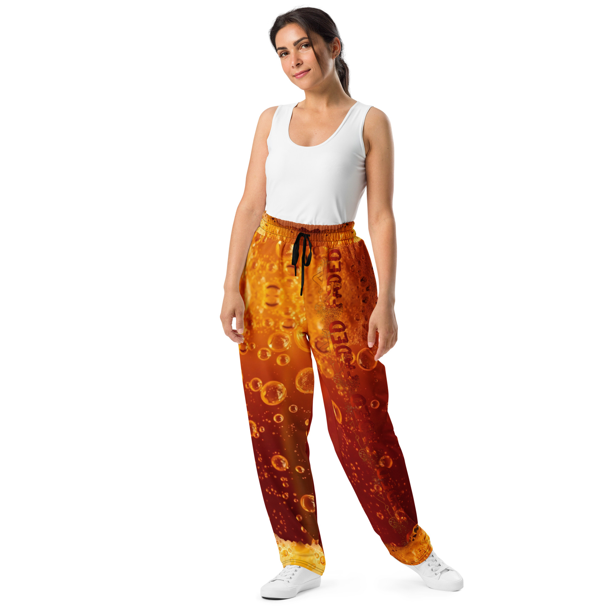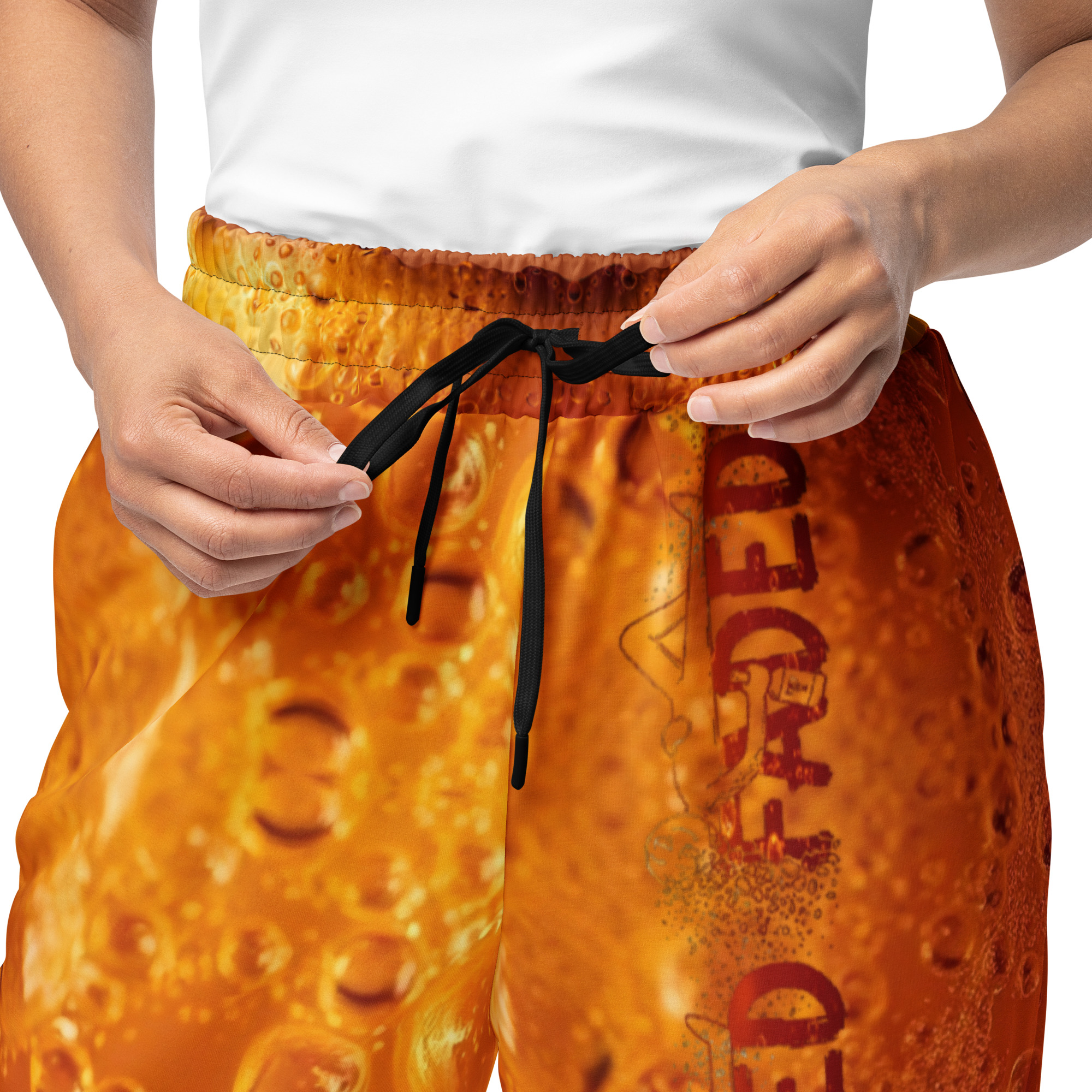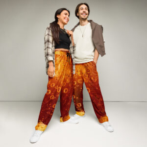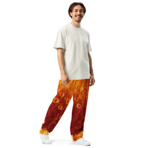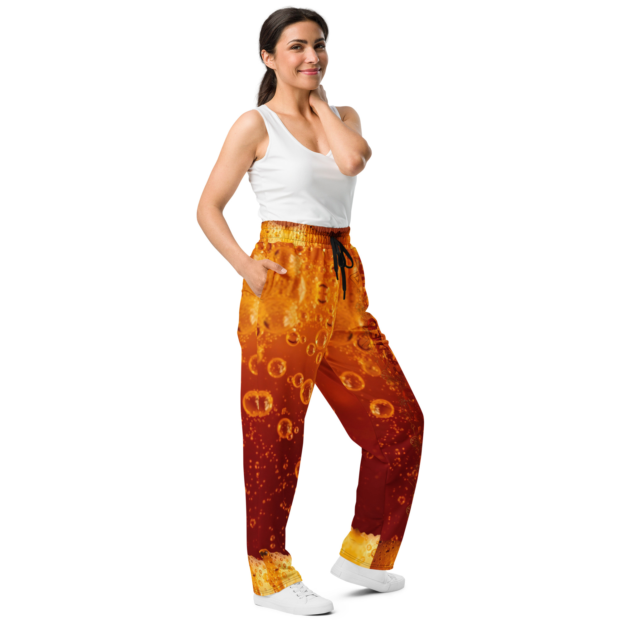 Comfort meets mind altering fashion style with these liquor inspired, wide-leg pants. Ideal for athletics, lounging around, or casual outings, these joggers come equipped with handy side pockets and are made almost entirely from recycled materials.